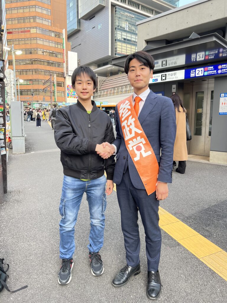 渋谷区議会議員選挙(2023年4月23日執行)の約1ヶ月前、渋谷駅前に置いて矢野桂太 渋谷区政対策委員(当時)と偶然出会い、意気投合。その数日後から同氏と駅頭活動を始める。